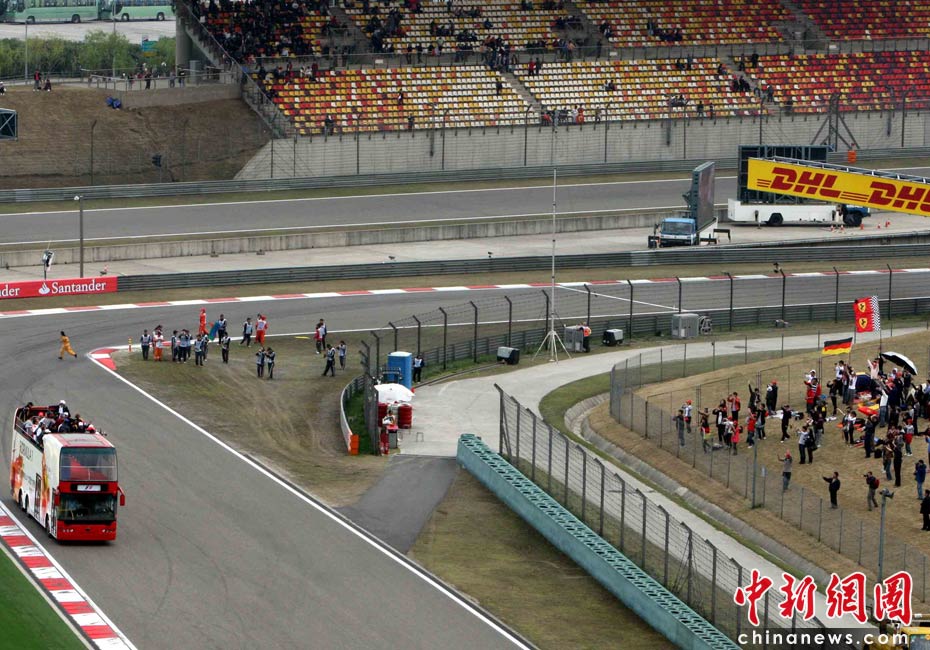 4月18日下午,2010國際汽聯(lián)F1世界錦標(biāo)賽上海站在上海國際賽車場(chǎng)舉行正式比賽,賽前24名參賽車手按照慣例乘坐敞篷車環(huán)繞賽場(chǎng)一周與車迷見面,但是寥寥無幾的觀眾與陰沉的天氣使上海F1賽事創(chuàng)下開賽七年以來觀眾人數(shù)最低的紀(jì)錄。中新社記者 任晨鳴 攝