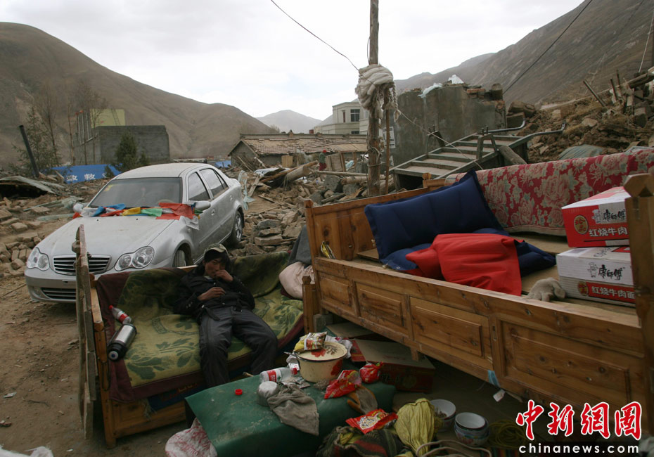 4月18日,玉樹結(jié)古鎮(zhèn)一男孩在家中的“客廳”上休息。地震后,他們將必需的起居用品搬到戶外。中新社發(fā) 蘇丹 攝