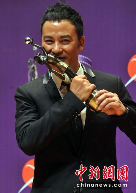4月18日晚,“第二十九屆香港電影金像獎”頒獎典禮在香港文化中心大劇院隆重舉行,影星任達(dá)華憑演出電影「歲月神偷」奪得最佳男主角獎項(xiàng)。圖為任達(dá)華親吻最佳男主角獎項(xiàng)。中新社發(fā) 鄧慶樂 攝