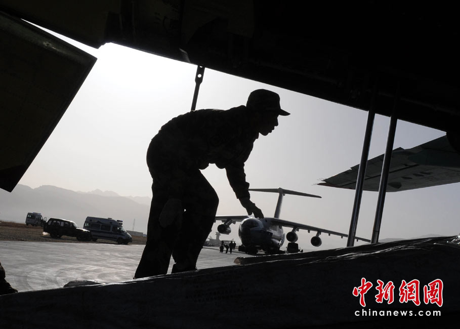 中國(guó)士兵正在空軍伊爾76重型運(yùn)輸機(jī)上搬下救災(zāi)帳篷,4月中旬以來(lái)他們連日在青海玉樹機(jī)場(chǎng)進(jìn)行抗震救災(zāi)工作。中新社發(fā) 賈國(guó)榮 攝
