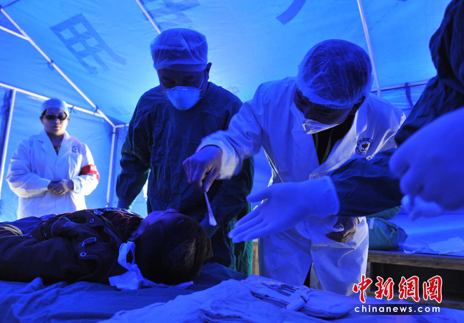四川省綿陽市中心醫(yī)院院長王東率領(lǐng)的醫(yī)療救護(hù)隊,正在為一名身上遭受多處地震創(chuàng)傷的玉樹藏族男孩換藥。他們借助汶川大地震的救護(hù)經(jīng)驗,援助青海玉樹縣醫(yī)院展開4月中旬的抗震救災(zāi)。中新社發(fā) 賈國榮 攝