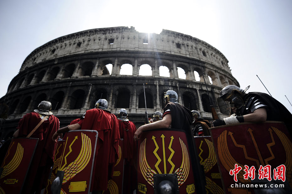 4月18日,意大利羅馬,男子打扮成武士在圓形競(jìng)技場(chǎng)附近參加游行,慶祝羅馬建城2763周年。圖片來(lái)源:中國(guó)新聞網(wǎng)
