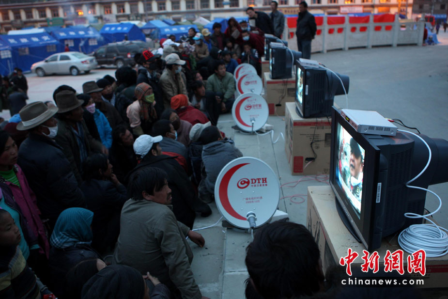 4月18日,青海玉樹(shù)結(jié)古鎮(zhèn)格薩爾王廣場(chǎng),青海玉樹(shù)廣電系統(tǒng)為受災(zāi)民眾安裝了4臺(tái)電視機(jī),直播震災(zāi)救援的最新進(jìn)展。中新社發(fā) 盛佳鵬 攝
