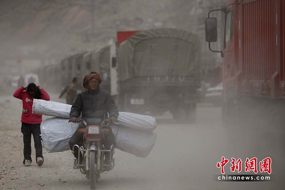 2010年4月19日,青海省玉樹縣結(jié)古鎮(zhèn),一位領(lǐng)取救災(zāi)物品的民眾騎著摩托車行走在塵土中。眾多的救援車輛在道路上行走以及大風天氣,結(jié)古鎮(zhèn)的道路經(jīng)常塵土彌漫。中新社發(fā) 盛佳鵬 攝