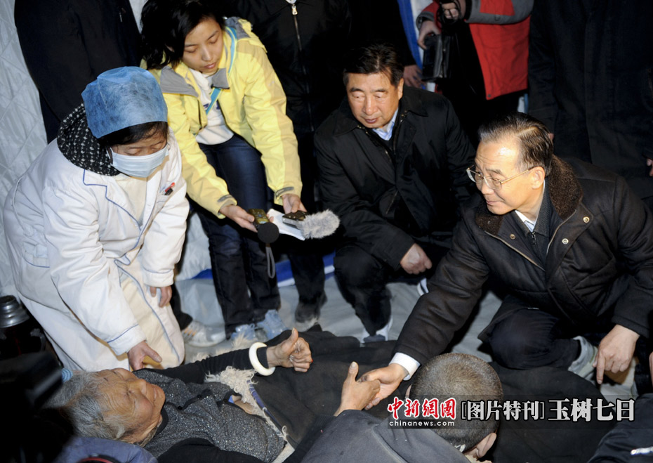 4月15日20時(shí),中國國務(wù)院總理溫家寶來到青海省玉樹縣玉樹自治州醫(yī)院看望受災(zāi)民眾。這是溫家寶握著一位藏族大媽的手問候其身體情況。國務(wù)院副總理回良玉、國務(wù)委員孟建柱參加看望慰問。中新社發(fā) 廖攀 攝