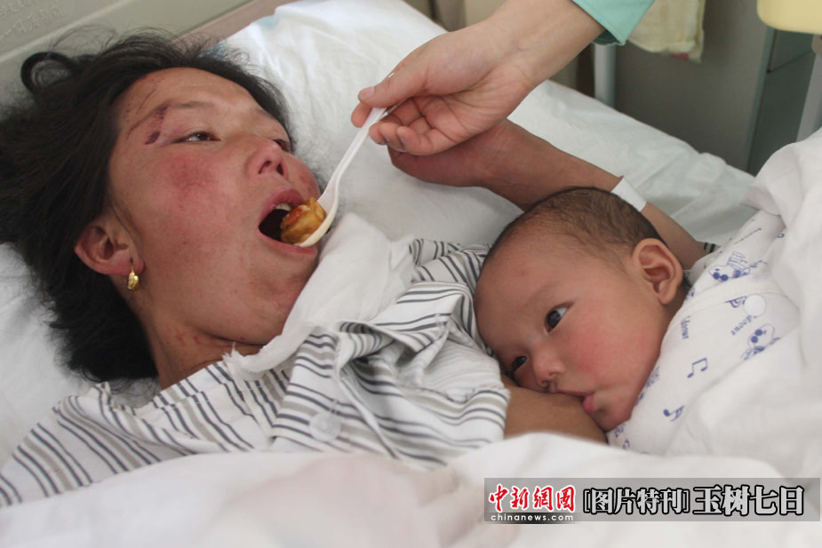 4月16日上午,護(hù)士正在給地震傷員30歲的尼瑪曲忠喂飯,她懷中4個月大的孩子正在吃奶。中新社發(fā) 梁萌 攝