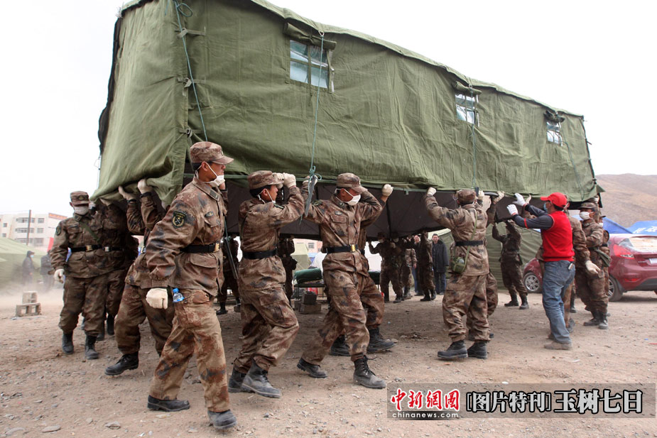 4月17日,青海玉樹體育場受災民眾安置點內(nèi),解放軍救援隊為安置點整體搬遷帳篷。中新社發(fā) 盛佳鵬 攝