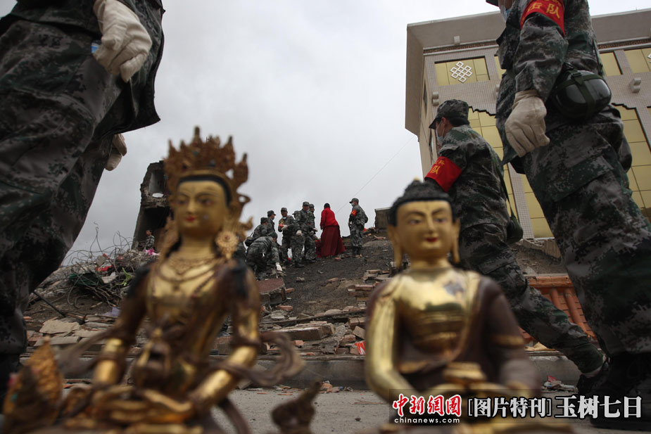 4月17日,青海玉樹結古鎮(zhèn)民主路,解放軍救援隊為受災民眾從房屋廢墟內搜索出多件法器。中新社發(fā) 盛佳鵬 攝