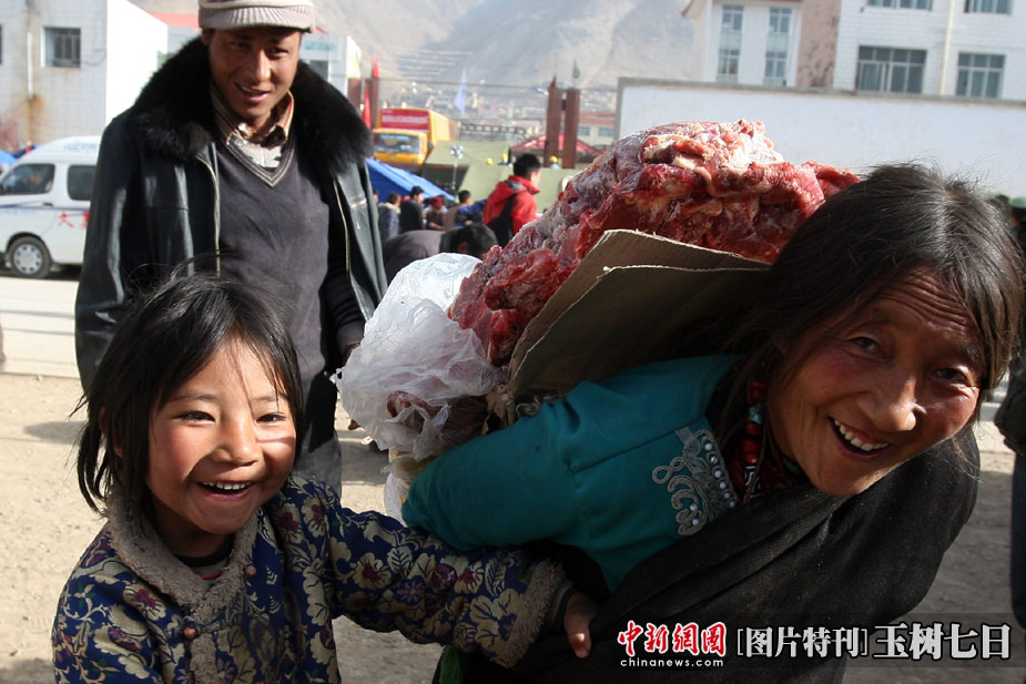 4月18日,青海玉樹(shù)體育場(chǎng)受災(zāi)民眾安置點(diǎn)內(nèi),得到副食品的祖孫倆笑容滿面。中新社發(fā) 盛佳鵬 攝