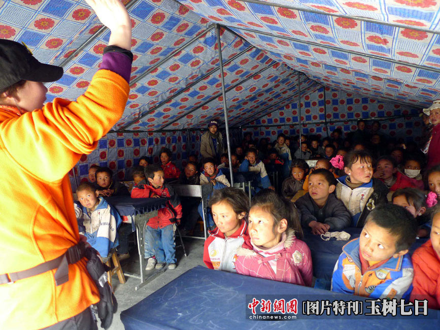 4月19日,青海玉樹縣第三完全小學的帳篷學堂里,學生們正在上課。中新社發(fā) 孫自法 攝