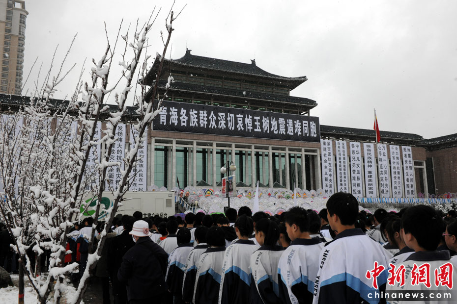 21日上午9時(shí)許,西寧各界民眾冒雪陸續(xù)來到該市最大的廣場(chǎng)——新寧廣場(chǎng),悼念玉樹地震遇難同胞。中新社記者 符永康 攝