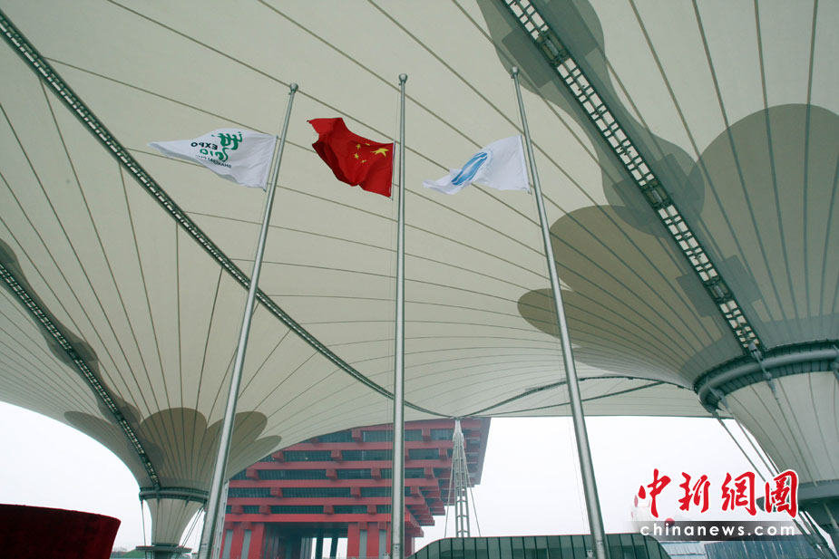 4月21日,上海世博園區(qū)降半旗哀悼玉樹地震遇難者。當(dāng)日,全國舉行哀悼活動,深切哀悼青海玉樹地震遇難同胞。中新社發(fā) 湯彥俊 攝