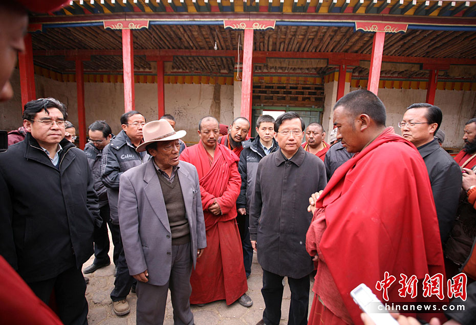 4月21日,青海省委書記強(qiáng)衛(wèi)來到玉樹縣結(jié)古鎮(zhèn)結(jié)古寺,親切看望慰問受災(zāi)僧侶,并詳細(xì)了解了結(jié)古寺受災(zāi)情,強(qiáng)衛(wèi)對(duì)寺管會(huì)在地震發(fā)生后參與抗震救災(zāi)給予了高度評(píng)價(jià)。中新社發(fā) 劉忠俊 攝