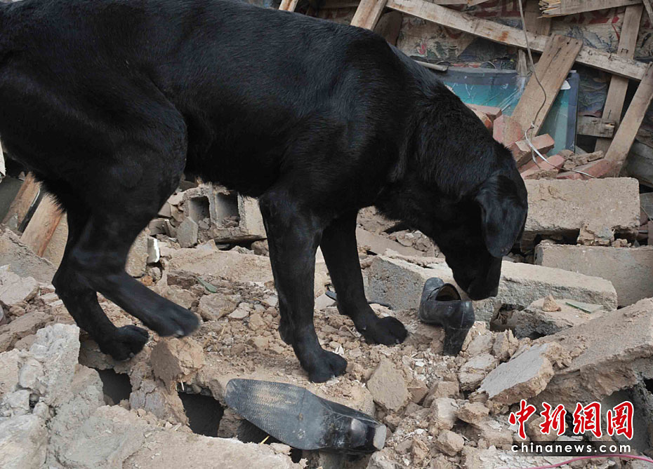 名貴的黑貝犬是中國國家救援隊趕赴青海玉樹地震災(zāi)區(qū)6只搜救犬隊成員之一,身價近百萬元人民幣。4月21日清晨八時許,它在救援隊員的帶領(lǐng)下,到玉樹地震災(zāi)區(qū)中心商業(yè)街廢墟里,四處奔波,盡職盡力尋找生命跡象。10時后,他和救援隊員都出現(xiàn)高原反應(yīng),暫時休整,準(zhǔn)備再戰(zhàn)。賈國榮 攝