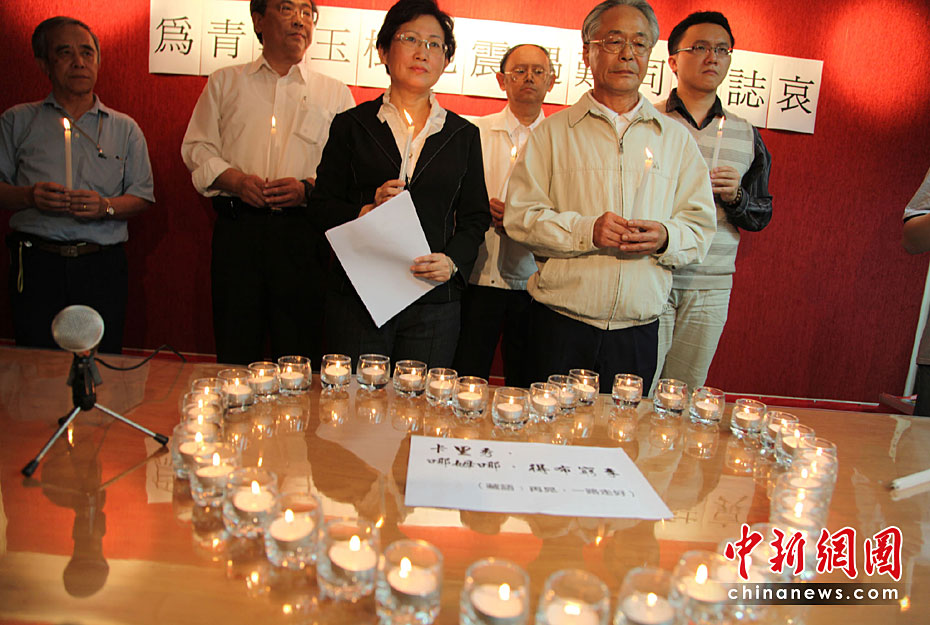 4月21日晚7時,中國統(tǒng)一聯(lián)盟在臺北以點燃蠟燭、3分鐘默哀、宣讀哀悼文等形式,與大陸同胞一起哀悼玉樹強震罹難者。前左為“統(tǒng)盟”主席紀欣,前右為勞動黨主席吳榮元。中新社發(fā) 董會峰 攝