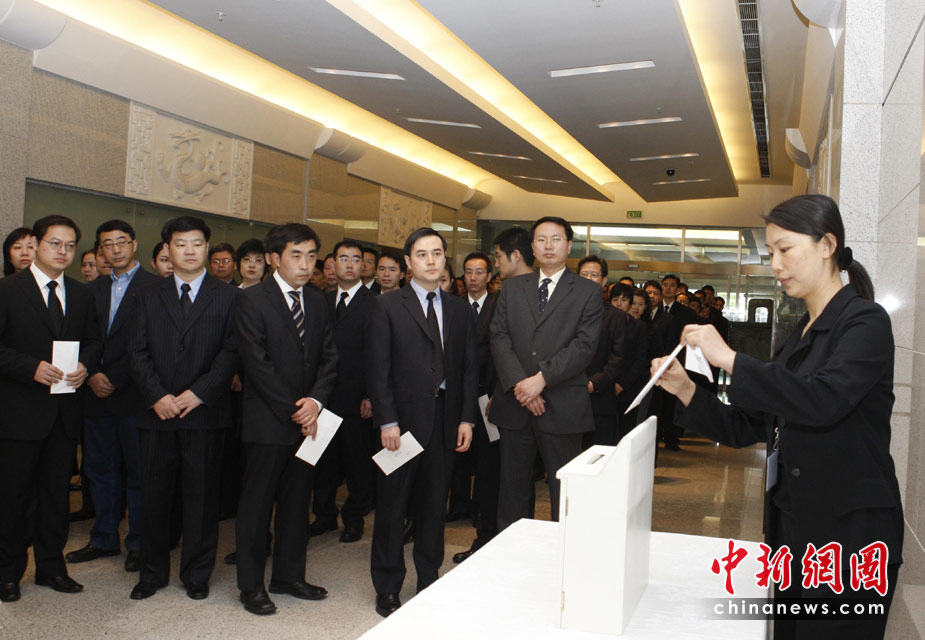 當(dāng)?shù)貢r間4月21日,中國駐紐約總領(lǐng)館舉行儀式,沉痛悼念青海玉樹地震遇難同胞。圖為悼念儀式后,中國駐紐約總領(lǐng)事館全體工作人員為青海玉樹捐款。中新社發(fā) 魏晞 攝