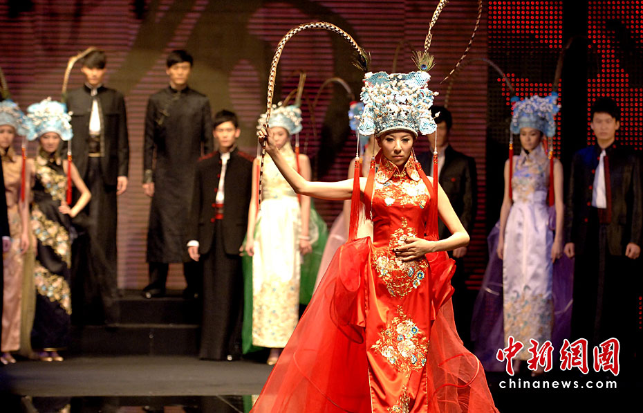 4月20日晚,首屆海西國(guó)際時(shí)裝周在福建石獅閉幕,本屆時(shí)裝周吸引了來自海峽兩岸的紡織服裝界企業(yè)家和知名服裝設(shè)計(jì)師。期間舉辦了12場(chǎng)時(shí)裝品牌和設(shè)計(jì)師作品動(dòng)態(tài)發(fā)布會(huì)。圖為模特展示古今潮流結(jié)合的服裝。王東明 攝