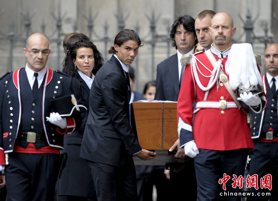 西班牙當(dāng)?shù)貢r間4月22日18時,國際奧委會終身名譽(yù)主席薩馬蘭奇的葬禮在巴塞羅那舉行,包括西班牙國王夫婦、現(xiàn)任國際奧委會主席羅格、F1車手阿隆索、巴薩俱樂部主席等在內(nèi)的政界和體育界4000多人出席,網(wǎng)球名將納達(dá)爾等負(fù)責(zé)抬靈柩,送別薩翁最后一程。 圖為西班牙網(wǎng)球明星納達(dá)爾忍悲痛抬棺木。