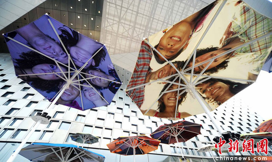 2010年4月22日,上海世博會(huì)主題館門(mén)前的觀眾等候區(qū),豎立著一把把遮陽(yáng)的花傘,每一把花傘上都印著四方友人的燦爛微笑。世博園區(qū)為了應(yīng)對(duì)大量客流,園區(qū)設(shè)置了大量遮陽(yáng)和避雨設(shè)施,遮陽(yáng)避雨面積總量達(dá)40萬(wàn)平方米。楊毅 攝