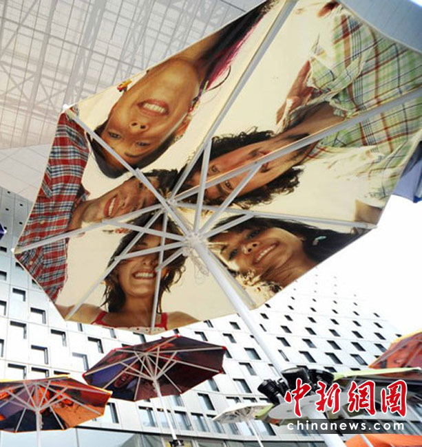 2010年4月22日,上海世博會主題館門前的觀眾等候區(qū),豎立著一把把遮陽的花傘,每一把花傘上都印著四方友人的燦爛微笑。世博園區(qū)為了應(yīng)對大量客流,園區(qū)設(shè)置了大量遮陽和避雨設(shè)施,遮陽避雨面積總量達(dá)40萬平方米。楊毅 攝