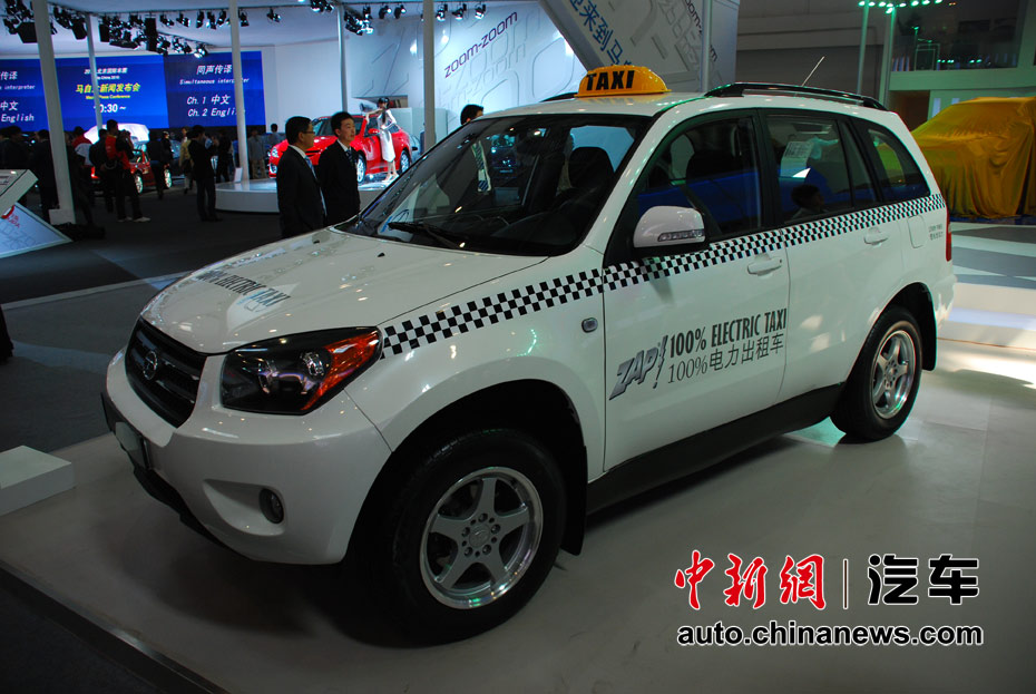 第十一屆北京國(guó)際車(chē)展23日開(kāi)幕,在本屆以“暢想綠色未來(lái)”為主題的車(chē)展上,新能源車(chē)成為最大亮點(diǎn)。圖為永源電動(dòng)出租車(chē) 王槊 攝