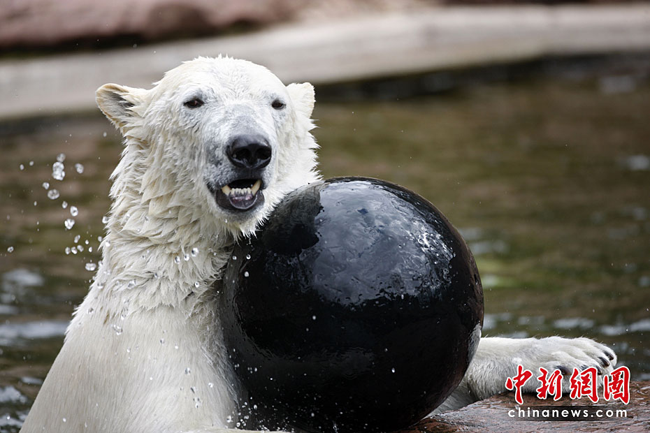 4月23日,德國(guó)紐倫堡動(dòng)物園內(nèi),兩頭北極熊在公園內(nèi)的水池中盡情玩耍,享受春天的陽光。圖片來源:中國(guó)新聞網(wǎng)
