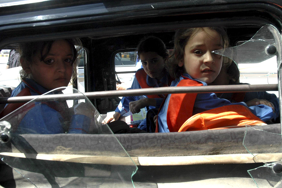 周一(19日),巴基斯坦白沙瓦發(fā)生炸彈爆炸事件。圖為學生坐在炸彈攻擊后的車內(nèi)。