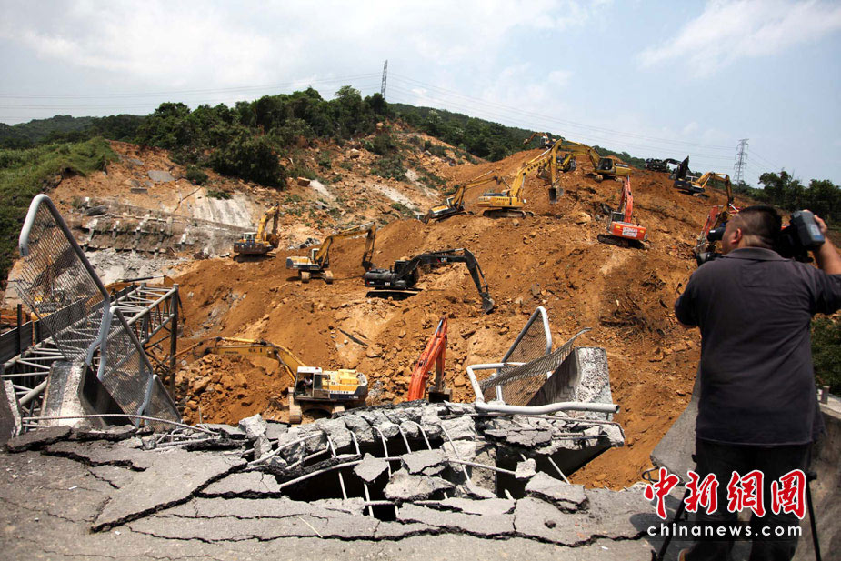 4月26日,臺(tái)灣“北二高”基隆段山崩斷橋意外第2天,工程人員繼續(xù)開(kāi)挖,將攔腰被斬?cái)嗟穆窐虿鸪,但尚未尋獲被埋的數(shù)輛人車(chē)。圖為當(dāng)日中午,記者另繞山路爬上斷橋拍到的情景,依然觸目驚心。中新社發(fā) 董會(huì)峰 攝