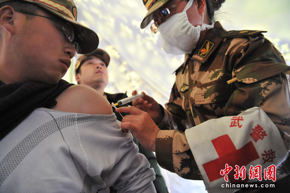 武警青?傟犪t(yī)院救護隊半夜為受傷的士兵補打疫苗。4月下旬的玉樹地震災區(qū)急缺防疫藥品,中新社發(fā) 賈國榮 攝