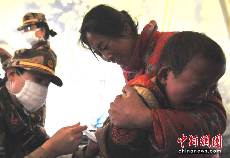 武警青海總隊玉樹支隊是最先投入抗震救災(zāi)的先鋒部隊,地震發(fā)生時恰逢部隊出操,營房嚴重受損而官兵平安無恙。這里立即成為抗震救災(zāi)的軍民和媒體的大本營之一,醫(yī)療救護隊和新型炊事車晝夜為軍民服務(wù)。集結(jié)在地震災(zāi)區(qū)的各路部隊從4月低之前全面轉(zhuǎn)入安置群眾和災(zāi)后重建,這里的的后勤已經(jīng)得到基本保障。 圖為醫(yī)療隊軍醫(yī)為受災(zāi)民眾治療。 中新社記者 賈國榮 攝