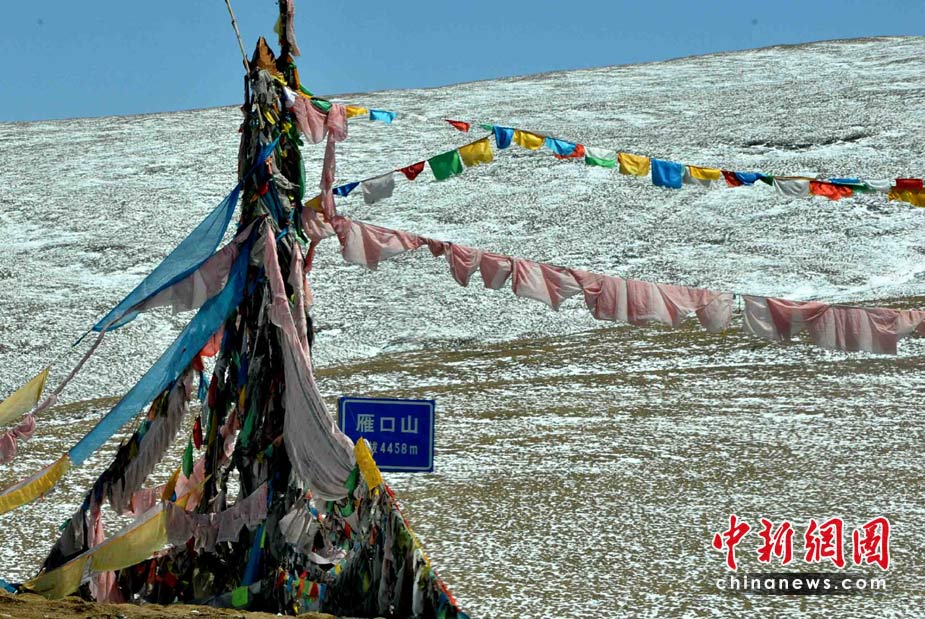 屬于長江、黃河、瀾滄江三江源地區(qū)的青海玉樹地震災區(qū),自然保護區(qū)的18個核心區(qū)域中,有10個位于玉樹州境內,占總面積的72%。4月下旬,記者深入災區(qū)縱深各地,災后重建正面臨保護生態(tài)環(huán)境、為三江源建起一道生態(tài)屏障的難題;近日緊迫的防疫工作,必須使用滅菌效果好、對環(huán)境無污染的消毒劑。圖為高原山口的經幡依舊。中新社記者 賈國榮攝