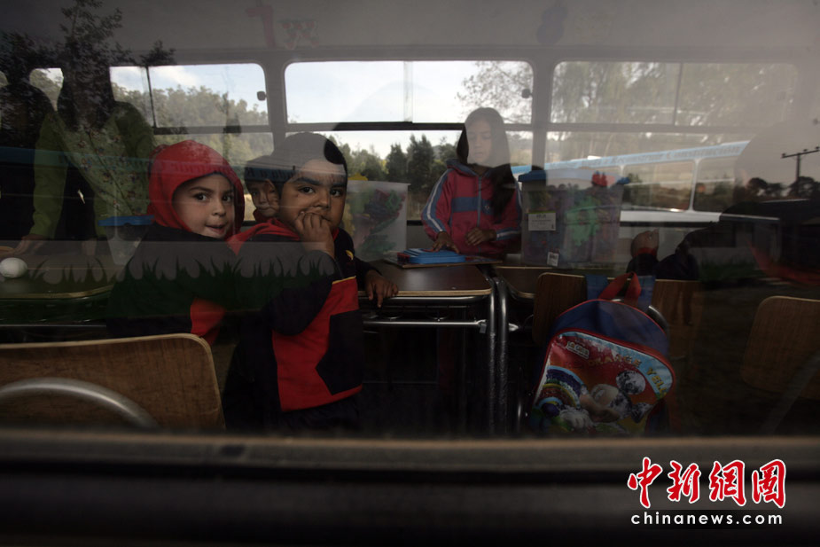 4月26日,今年2月遭受8.8級強(qiáng)烈地震的智利康塞普西翁市,兒童們在“巴士學(xué)!崩锷险n。