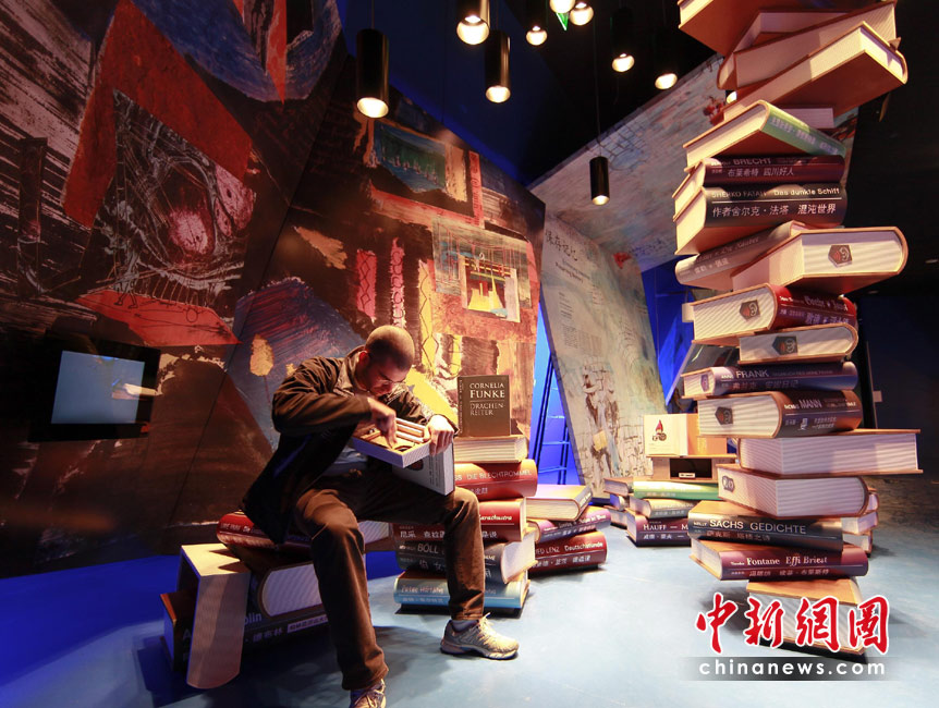4月27日,上海世博會德國館向媒體記者開放,一名工作人員還在緊張布置書籍堆砌的景觀。中新社發(fā) 盛佳鵬 攝