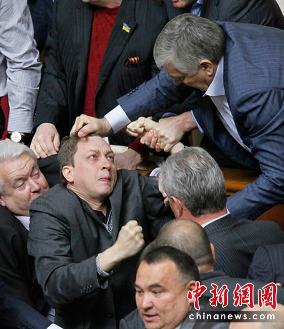 4月27日,基輔,烏克蘭議會(huì)就俄羅斯黑海艦隊(duì)駐扎問(wèn)題進(jìn)行討論時(shí)出現(xiàn)混亂,數(shù)千人在議會(huì)外示威,會(huì)場(chǎng)內(nèi)有人投擲煙霧彈和雞蛋,大廳內(nèi)煙霧彌漫,場(chǎng)面一度混亂。