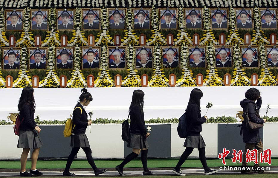 4月29日上午,韓國(guó)“天安”艦遇難官兵遺體告別儀式在平澤海軍第二艦隊(duì)司令部安保公園舉行。韓國(guó)總統(tǒng)李明博攜夫人參加告別儀式。圖片來(lái)源:中國(guó)新聞網(wǎng)