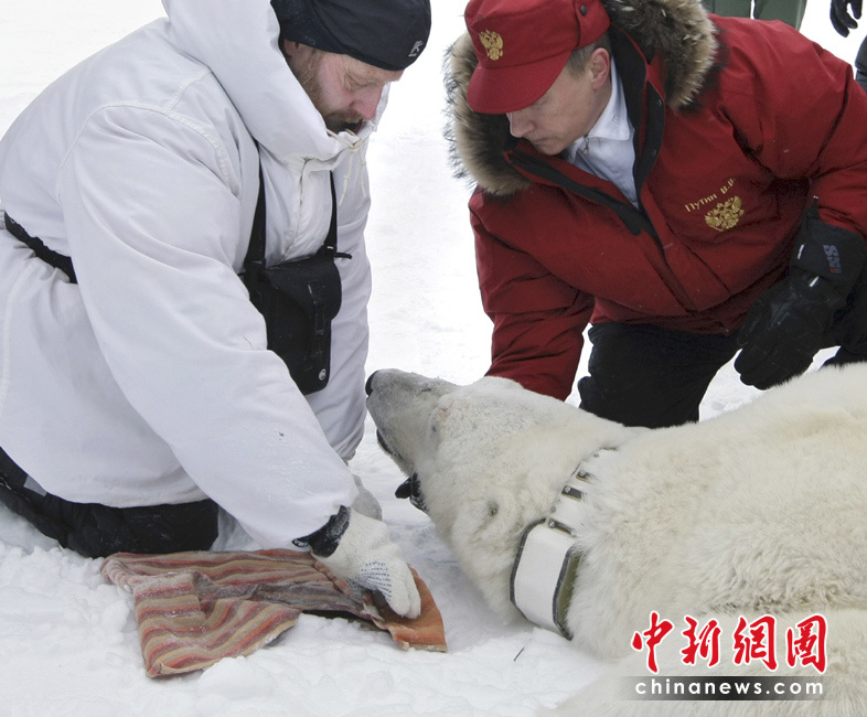 4月29日,俄羅斯總理普京參觀亞歷山大地島(法蘭士約瑟夫地群島)。 普京還與在研究學(xué)者一同給通過專門的陷阱捕獲的北極熊戴上衛(wèi)星定位項圈。此外,學(xué)者們還與普京一起給北極熊進行測量和秤體重,
