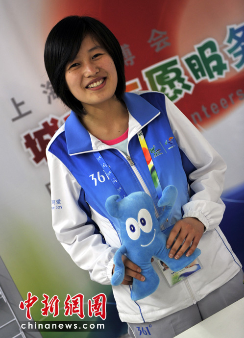 小郭姑娘很熱情地幫助過往的路人,但面對(duì)鏡頭的時(shí)候卻十分靦腆,不過還是很配合地與海寶合影,并亮出了“志愿者的微笑”。小郭說,作為志愿者,要“齊心協(xié)力,心系世博”,并表示盼望世博會(huì)能夠精彩難忘。