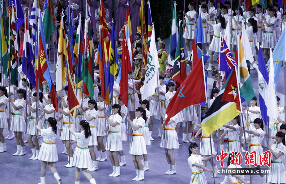 4月30日,中國(guó)2010年上海世博會(huì)開幕式在上海世博園世博文化中心舉行。圖為參展方旗幟方隊(duì)入場(chǎng)。中新社發(fā) 湯彥俊 攝