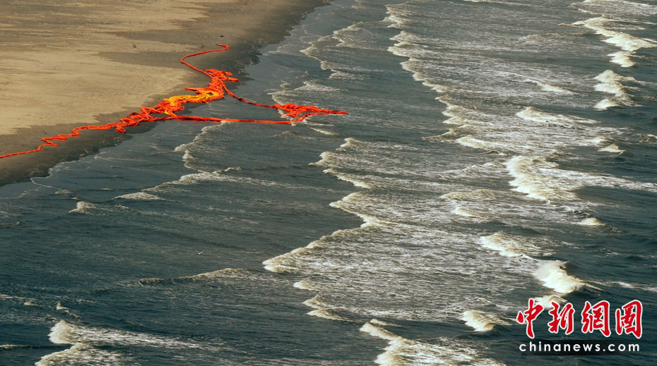 4月30日,在美國(guó)路易斯安那州海岸,為阻隔原油擴(kuò)散而設(shè)的護(hù)欄帶被海風(fēng)浪沖到岸邊。當(dāng)天,美國(guó)總統(tǒng)奧巴馬下令調(diào)查墨西哥灣石油鉆井平臺(tái)爆炸事件,以避免將來類似事件再次發(fā)生。平臺(tái)爆炸沉沒后泄漏的原油當(dāng)天已漂至美國(guó)沿岸。圖片來源:中國(guó)新聞網(wǎng)