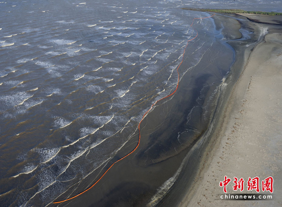 4月30日,在美國(guó)路易斯安那州海岸,為阻隔原油擴(kuò)散而設(shè)的護(hù)欄帶被海風(fēng)浪沖到岸邊。當(dāng)天,美國(guó)總統(tǒng)奧巴馬下令調(diào)查墨西哥灣石油鉆井平臺(tái)爆炸事件,以避免將來類似事件再次發(fā)生。平臺(tái)爆炸沉沒后泄漏的原油當(dāng)天已漂至美國(guó)沿岸。圖片來源:中國(guó)新聞網(wǎng)