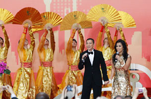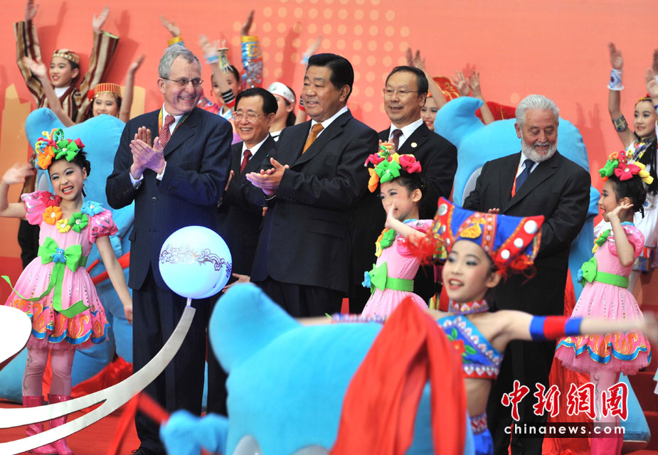 2010年上海世界博覽會開園儀式于5月1日上午舉行,全國政協(xié)主席賈慶林與國際展覽局主席藍峰共同啟動按紐。中新社發(fā) 賈國榮 攝