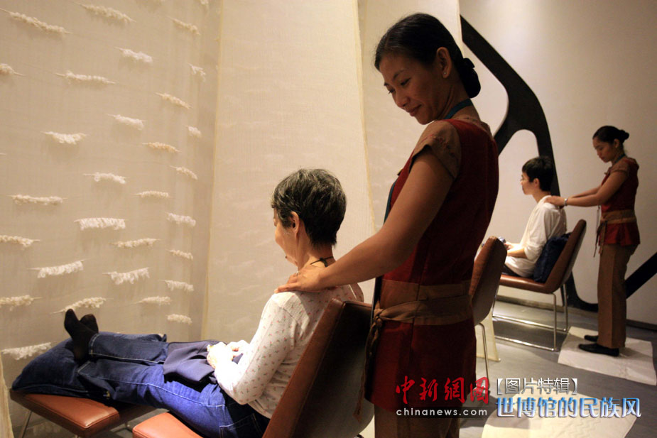 5月1日,上海世博會(huì)菲律賓館開(kāi)館,其館內(nèi)設(shè)置的傳統(tǒng)按摩深受參觀者歡迎,一早便預(yù)約完畢。中新社發(fā) 潘索菲 攝