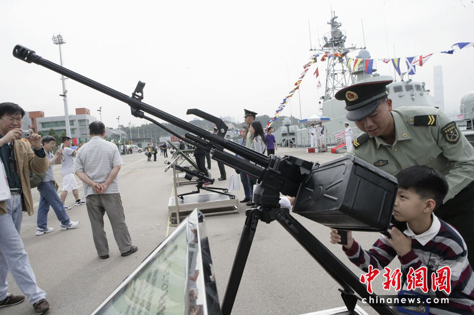 為慶!拔逡弧眹H勞動節(jié),進(jìn)一步增進(jìn)與香港社會各界相互溝通與交流,中國人民解放軍駐香港部隊5月1日開放了昂船洲軍營,共有約13000名市民前往參觀。圖為香港市民近距離參觀武器展示。中新社發(fā) 張勤 攝
