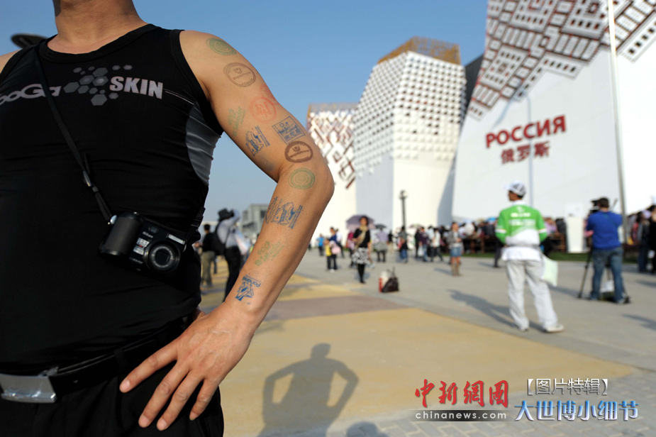 5月1日,上海世博會(huì)正式開園,當(dāng)日有20萬人次的游客參觀了世博園。世博首日,許許多多的小細(xì)節(jié)都帶給人一種全新的體驗(yàn)。圖為一男子胳膊上蓋滿世博園多個(gè)展館通行紀(jì)念印章,收獲頗豐。中新社發(fā) 陳文 攝