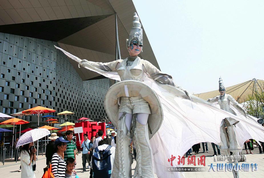 5月1日,上海世博會(huì)正式開園,當(dāng)日有20萬人次的游客參觀了世博園。世博首日,許許多多的小細(xì)節(jié)都帶給人一種全新的體驗(yàn)。圖為荷蘭演員在上海世博園主題館前表演長腳舞。中新社發(fā) 袁云 攝