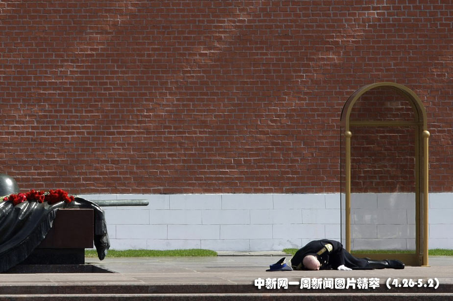 29日(周四),在克里姆林宮,一名俄羅斯士兵被高溫?fù)舻埂?/p>