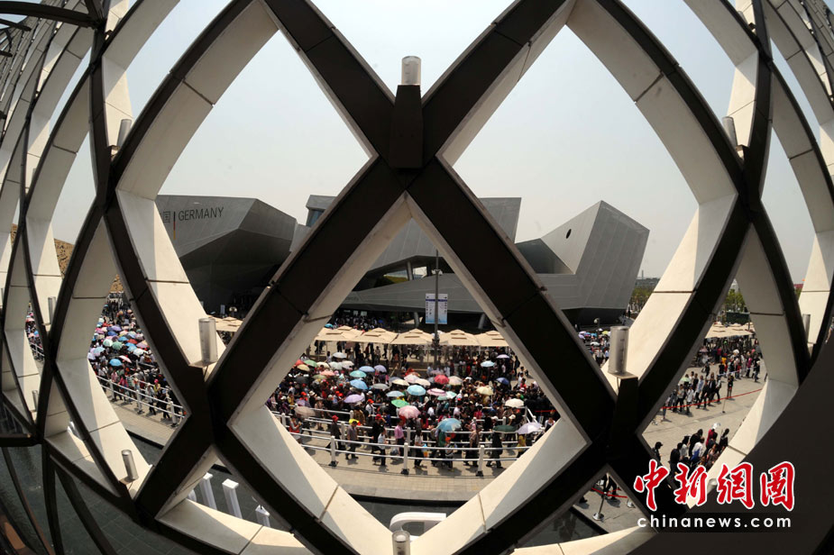 5月2日,上海世博園開園第二天迎來客流高峰。在正午的陽光下,從法國館的藝術格柵中眺望德國館,別有一番景觀。 中新社發(fā) 廖攀 攝