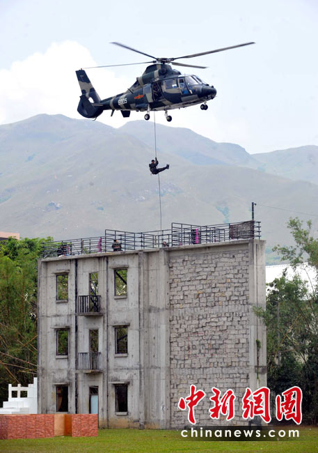 為慶!拔逡弧眹H勞動(dòng)節(jié),進(jìn)一步增進(jìn)與香港社會(huì)各界相互溝通與交流,中國人民解放軍駐香港部隊(duì)5月2日開放了石崗軍營。圖為駐港部隊(duì)反恐突擊和陸空協(xié)同救援演練表演。 中新社發(fā) 鄧慶樂 攝