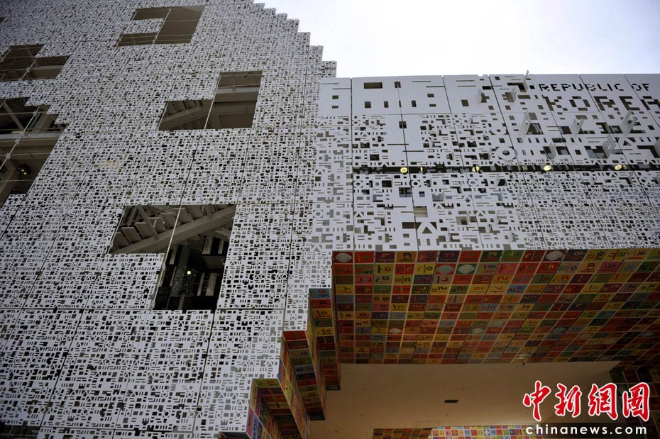 韓國館是由韓文來“建造”的,遠觀展館,由幾個碩大的韓文字母連接而成;近看外墻,則為無數(shù)凹凸有致的韓文字母。中新網(wǎng)記者 王紅綱 攝