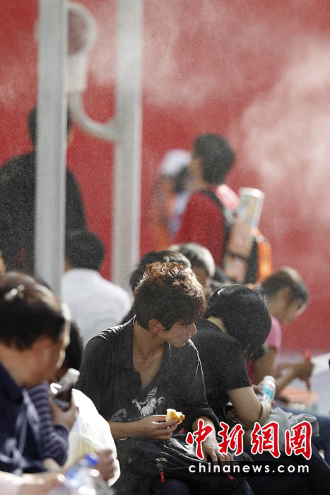 2010年5月2日,上海世博園區(qū)啟動(dòng)各項(xiàng)控溫降溫設(shè)施應(yīng)對(duì)高溫。圖為游客休息區(qū)內(nèi)啟動(dòng)噴霧降溫系統(tǒng)。中新社記者 盛佳鵬 攝